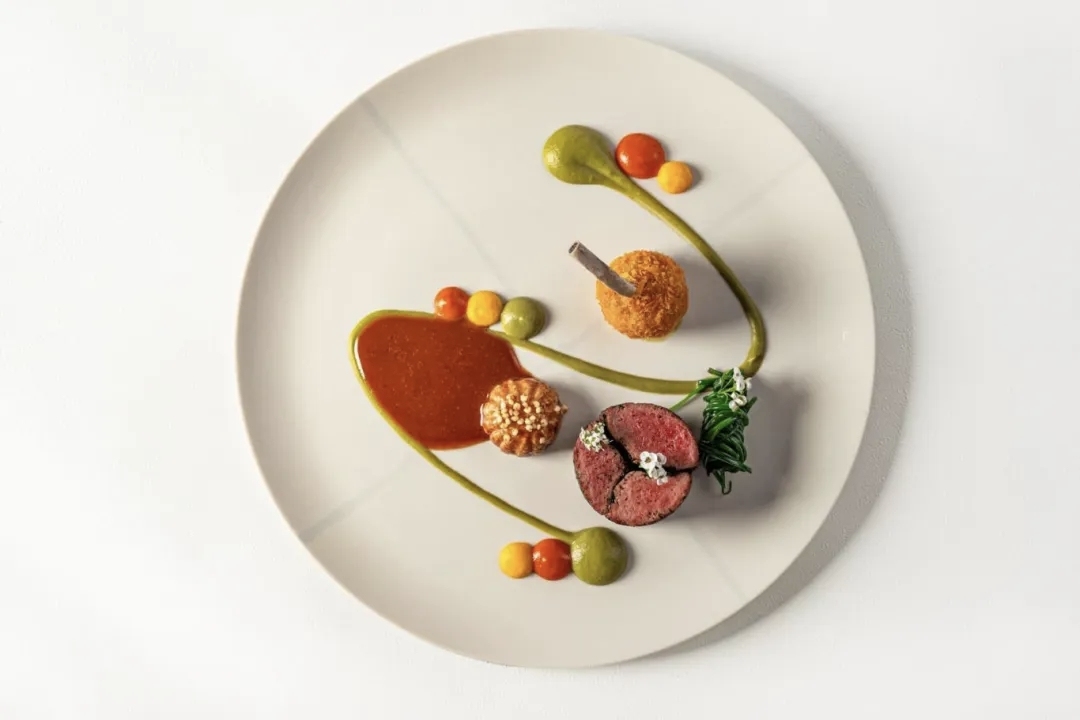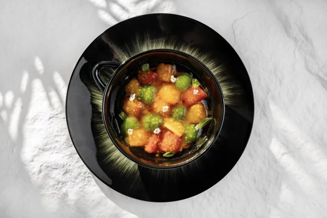 至于南沙奄仔蟹,郭师傅为了将南沙水域特有的青蟹之清甜味道发挥极致,搭配了肥美细腻的法国鸭肝,以及南沙万顷沙镇和绍兴盛产的本地番茄与慢宋黄酒,让南北味道在此邂逅。发酵后的番茄酸香更具深度,与黄酒的米香脂香呼应,提升鸭肝与蟹膏的浓郁。奄仔蟹的鲜与鸭肝的醇在口中融合后,发酵番茄的层次酸香唤醒罗勒的草本清新,呈现出丰腴与爽冽并存的平衡感。