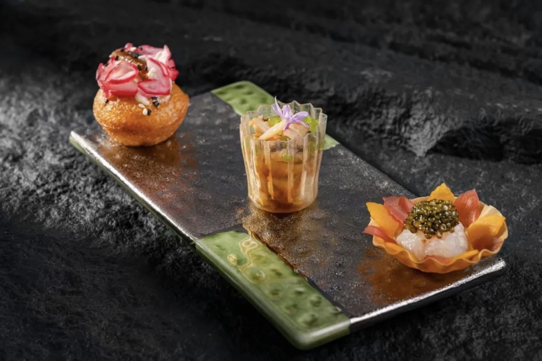 南沙凤尾鱼籽是由疍家妇女手工制作、轻盐腌制,保留了细腻的颗粒感与纯净的海味。郭师傅采用了芥末蛋黄酱与之作伴,用蛋黄发酵的奶香与辛香料调和鱼籽的咸鲜,品尝时让细腻的鱼籽在舌尖绽放,如浪花般掠过口腔。